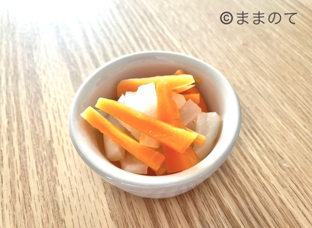 みかん果汁のみで味付けされた簡単なますです。酸味と甘味のバランスも良く、赤ちゃんでも食べやすいでしょう。にんじんやだいこんの他にも、かぶやきゅうりなどを使用してもおいしく仕上がりますよ。
