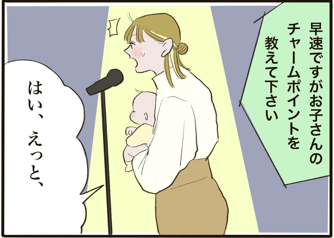 はるくんのミルクスケジュールを悩んだり悩むのを諦めたりしながら、無事にオーディション会場に到着!他の赤ちゃん&ママたちのきらびやかな雰囲気に圧倒されつつも、はるくんのご機嫌は最高潮に。いよいよ、ほかほか命さん親子の面接がはじまります。