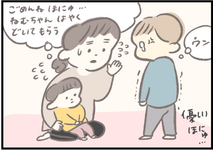 上の子だからといって我慢ばかりをさせるのではなく「ごめんねほにゅ、ねむちゃんにはやくどいてもらうね」というつぶみさんの声かけがあったからこそ、ほにゅくんも納得できたのかもしれませんね。もちろん約束通り、あとからたくさん抱きしめてあげたそうですよ。