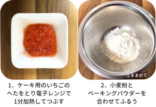 1.ケーキ用のいちごのへたをとりレンジで1分加熱してつぶす。