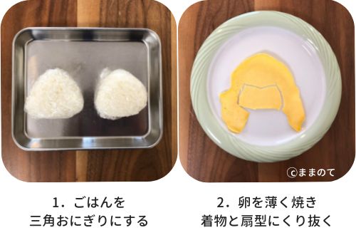 2.卵を薄く焼き男雛の着物と女雛の扇型にくり抜く。