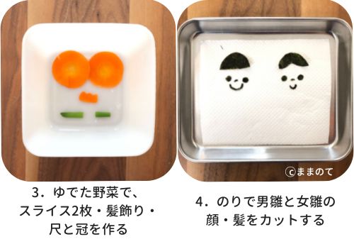 3.ゆでた野菜で、スライス2枚・髪飾り・尺と冠を作る。