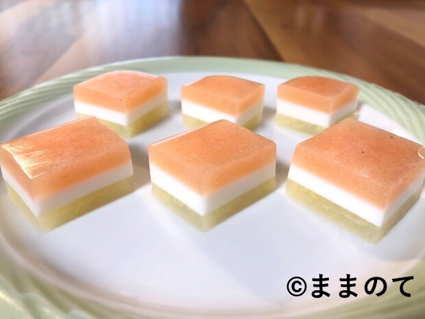 ピンク層は人参ピューレ、白い層は豆乳、緑層は枝豆ピューレなど代用できる食材を選んでみるのも良いですね。