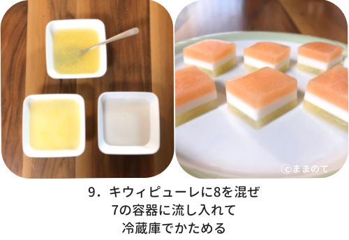 9.キウィピューレに8を混ぜ7の容器に流し入れて冷蔵庫でかためる。