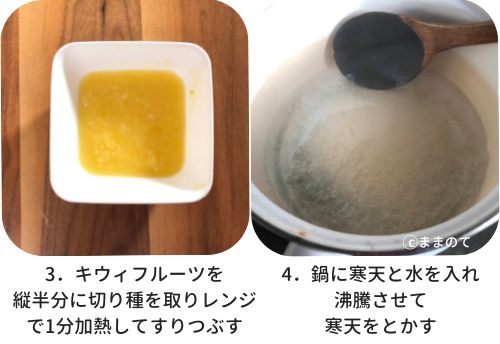 3.キウィフルーツを縦半分に切り種を取り、レンジで1分加熱してすりつぶす。