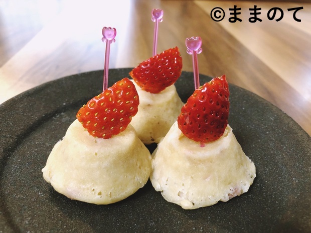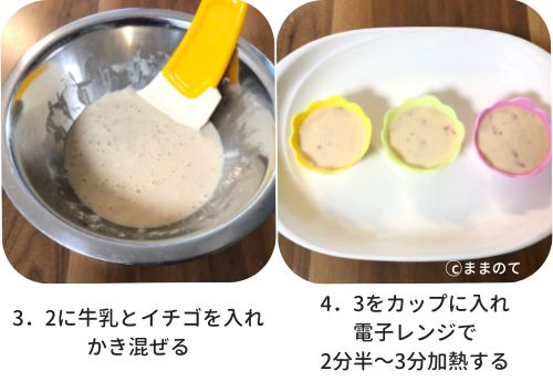 離乳食用の果物や野菜のピューレをいちごに代用すると時短になります。蒸しパンミックスを使うのも手間が省けておすすめですよ。牛乳は粉ミルクをお湯で溶いたものでも代用できます。
