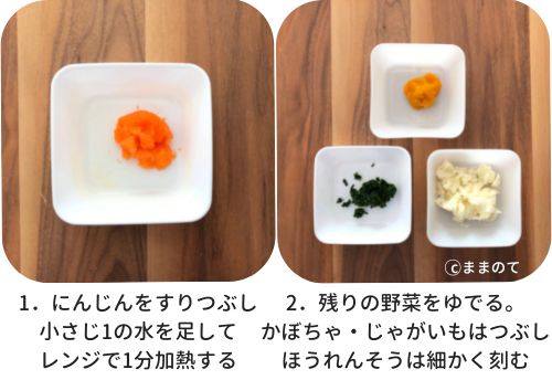 1.にんじんをすりつぶし、小さじ1の水を足してレンジで1分加熱する。