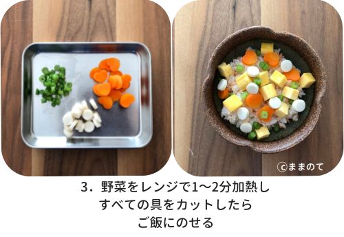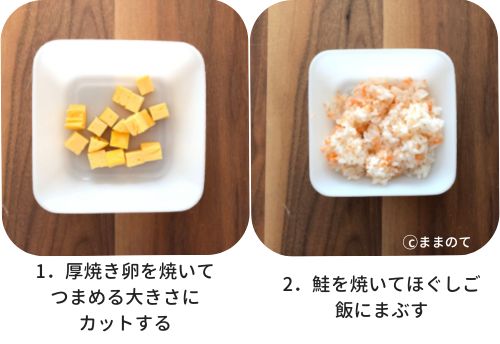 細かく具材を刻む一般的なちらし寿司とは違い、手づかみ食べができる大きさに具材をカットするのがポイントです。味付きの鮭は塩抜きをしてから使いましょう。