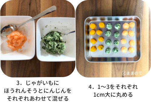 3.じゃがいもにほうれんそうとにんじんをそれぞれあわせて混ぜる。