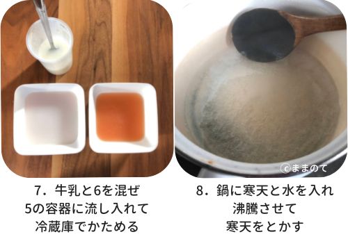 7.牛乳と6を混ぜ5の容器に流し入れて冷蔵庫でかためる。