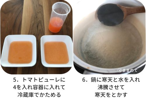 5.トマトピューレに4を入れ容器に入れて冷蔵庫でかためる。