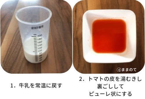 2.トマトの皮を湯むきし裏ごししてピューレ状にする。
