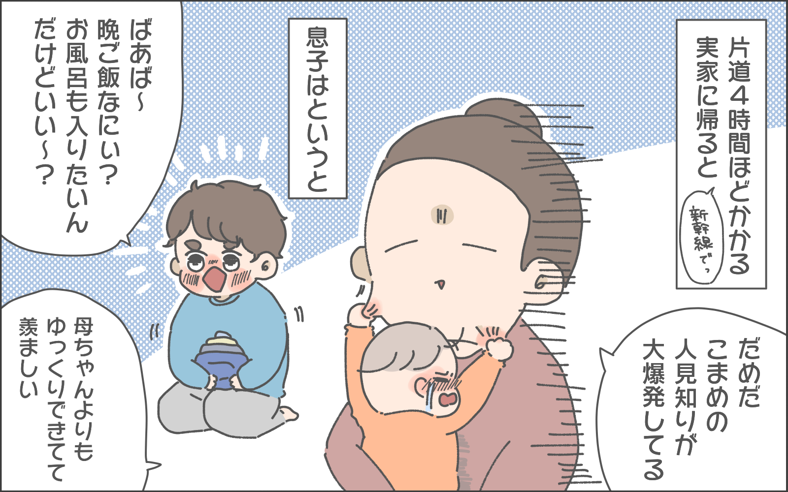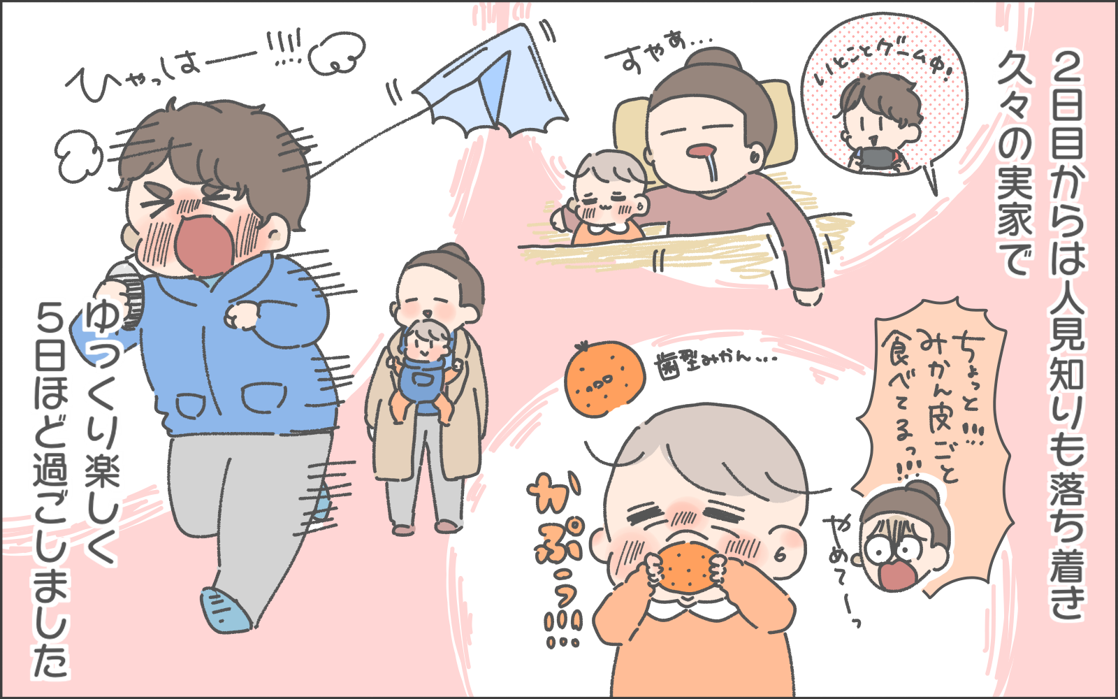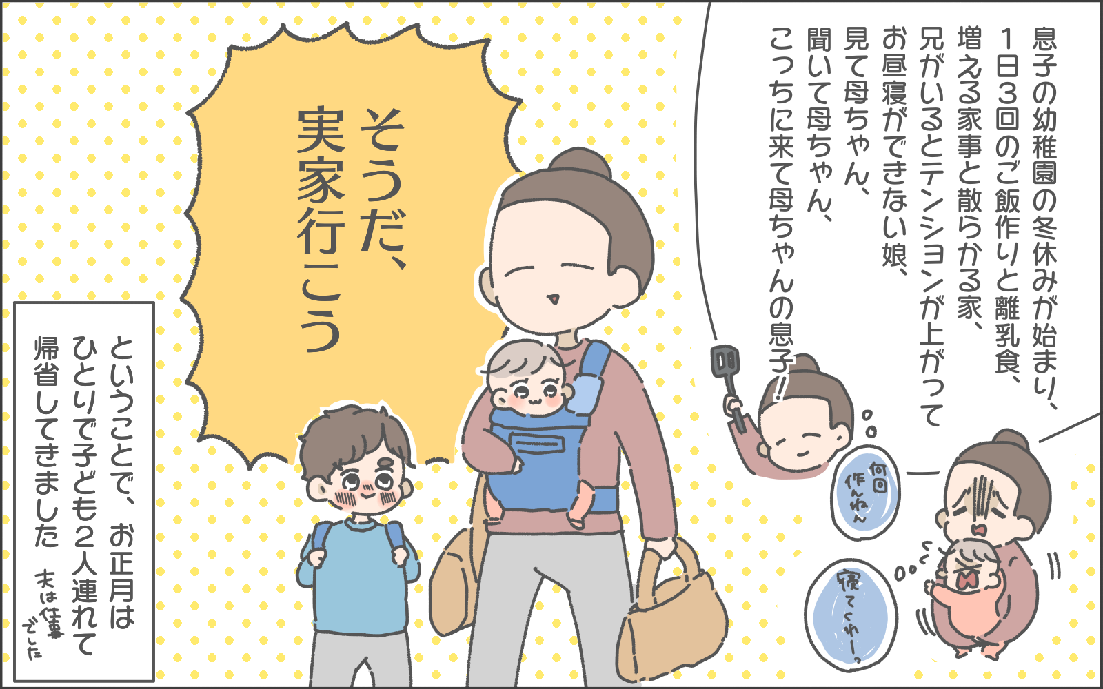 育児マンガ家おかめ(@omame_okame)さんの日常の出来事や奮闘をマンガでお届けします。お兄ちゃんのの幼稚園も冬休みに入った年末。娘のこまめちゃんとお兄ちゃんとの2人の育児に追われることになったおかめさん。そうだ、実家へ帰ろう…!と思い立ち、実家へ帰省することに。さてどんなお正月を過ごしたのでしょうか…?