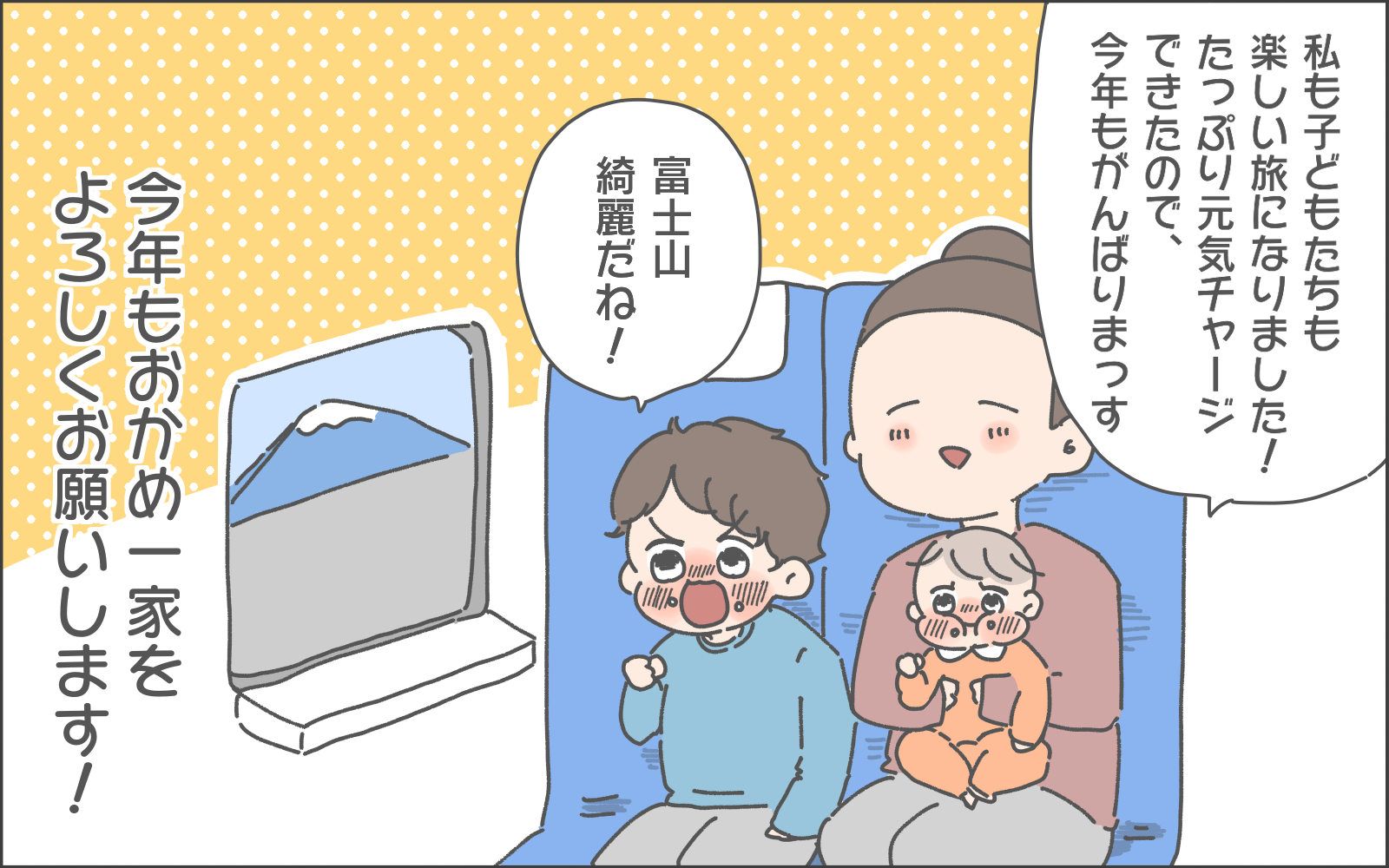 新幹線を利用し片道4時間で着いた実家で、親戚や祖父母などに会い、お正月をゆっくりと過ごすことができたそうです。思い出もまた増え、元気チャージまででき良かったですね!