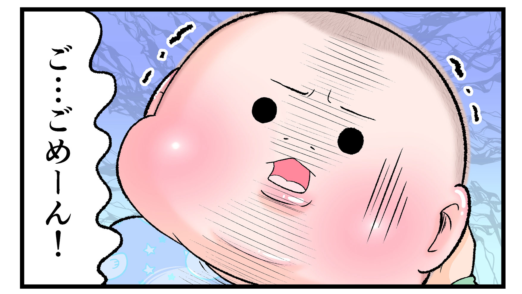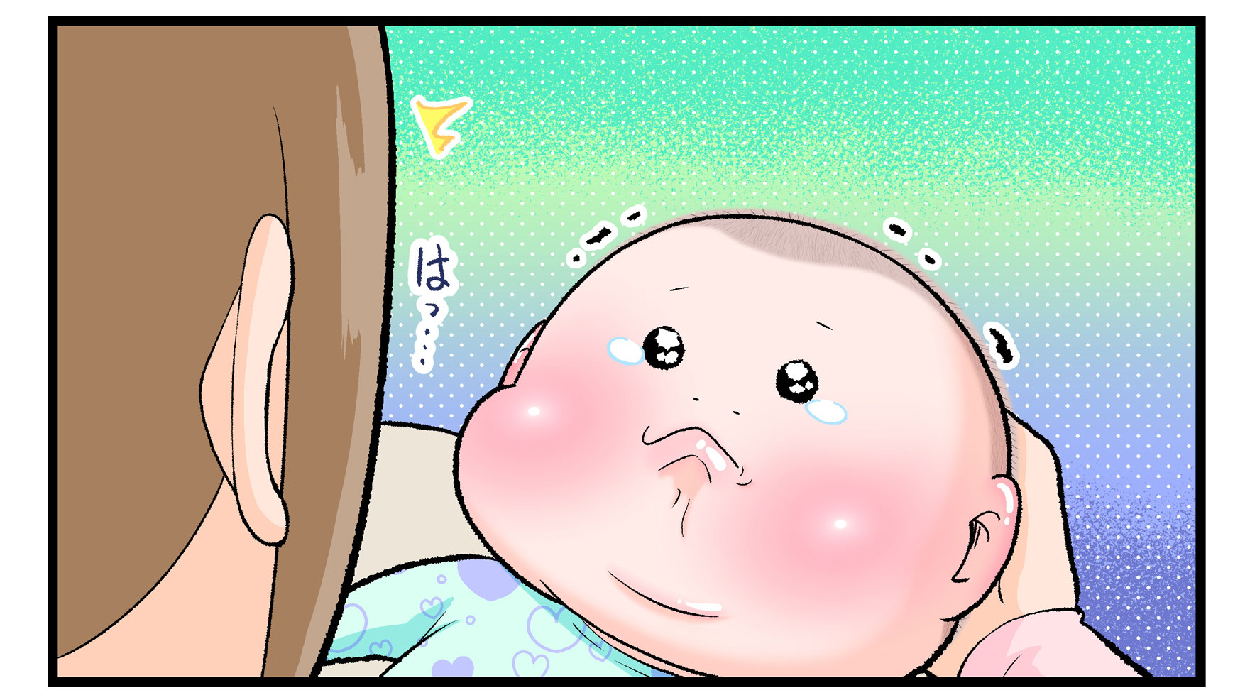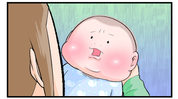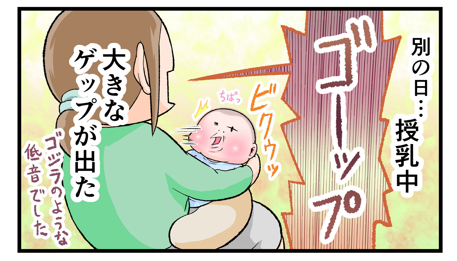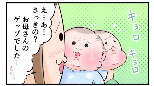にくきゅうぷにおさんの長男・ぷにおくん(当時1ヶ月)にとってママから発せられる盛大なゲップの音は、まさに未知との遭遇だったのでしょう。最初は驚きすぎて泣き出してしまったぷにおくんですが、2回目のときは訴えの顔でママを見つめています。これは謎の音の恐怖からか「まさかママ?」という疑いの念からか…想像がふくらみますね(笑)。