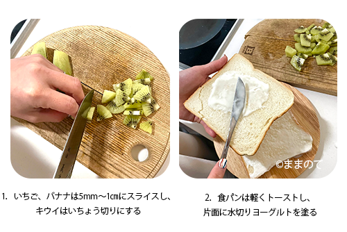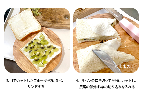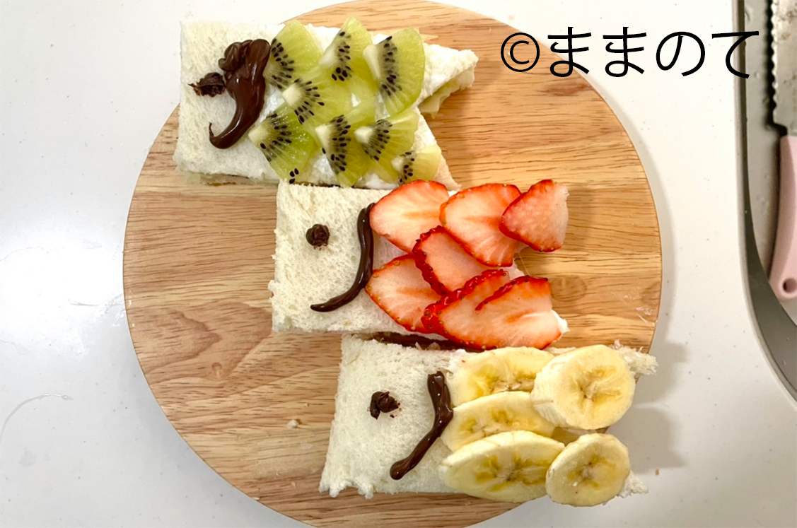 食パンは軽くトーストすることでカットするとき崩れにくくなります。上に乗せるフルーツはきれいに切ることができたものを選ぶと見栄えが良くなりますよ。