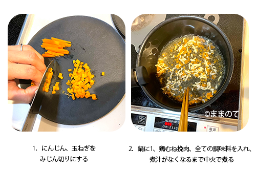 2.鍋に1、鶏むね挽肉、全ての調味料を入れ、煮汁がなくなるまで中火で煮る