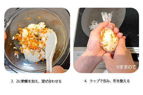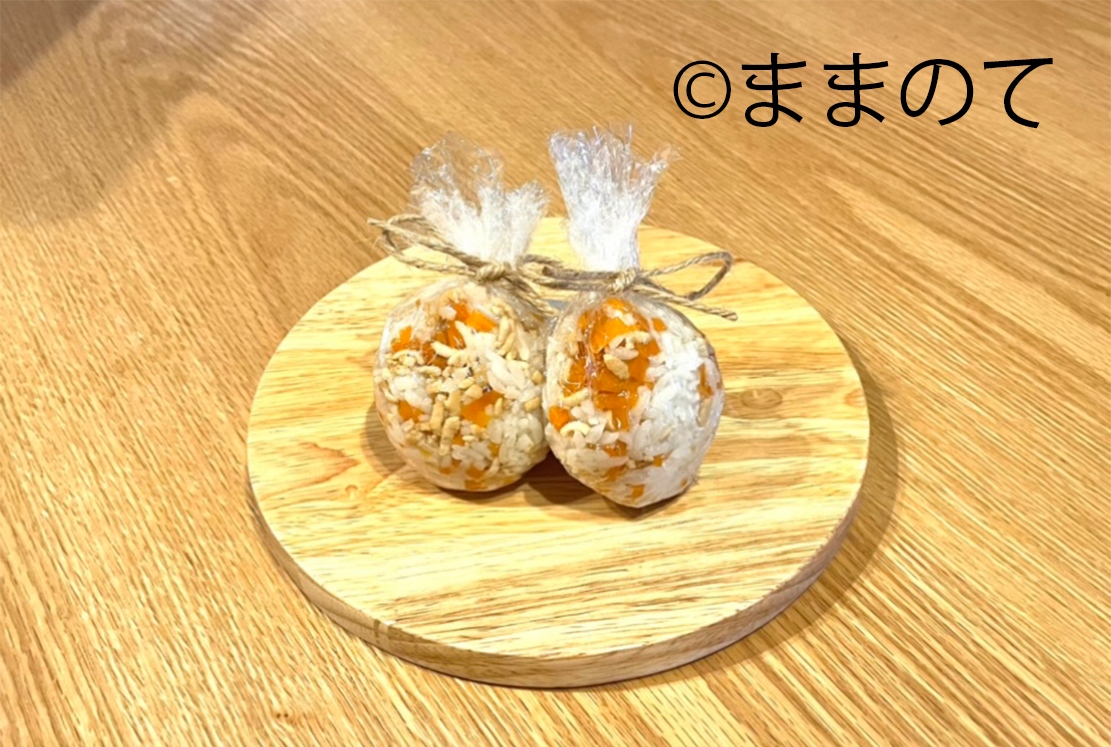 成形するときはラップでしっかり包むと、形が崩れず赤ちゃんも食べやすいです。最後に紐でラップの口をリボン結びにすると、見た目も可愛くなりますよ。