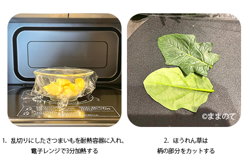 1.乱切りにしたさつまいもを耐熱容器に入れ、電子レンジで3分加熱する