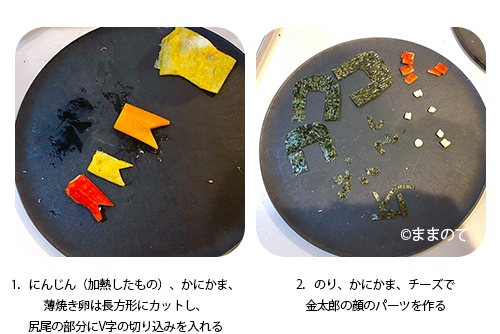 2.のり、かにかま、チーズで金太郎の顔のパーツを作る