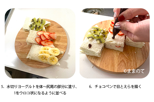 5.水切りヨーグルトを体〜尻尾の部分に塗り、1をウロコ状になるように並べる
