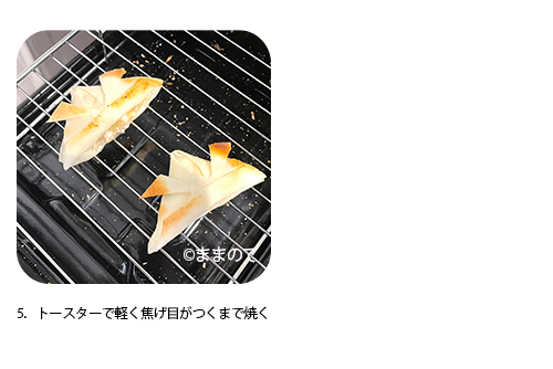 4.食パンの耳を切って半分にカットし、尻尾の部分はV字の切り込みを入れる