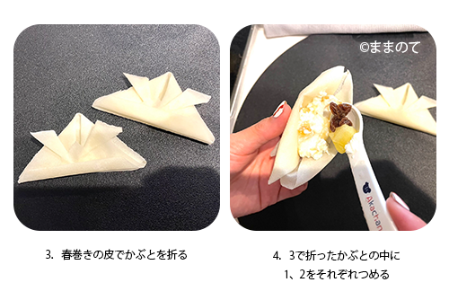 春巻きの皮のかたい部分は、形を楽しんだ後に細かくカットするなどして誤嚥(ごえん)を起こさないように気をつけましょう。