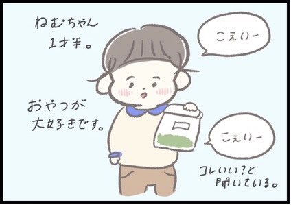 SNSで大人気つぶみさん(@tbys141122)の育児マンガです。おせんべいやビスケット、バナナなどおやつが大好きな赤ちゃんは多いですよね。つぶみさんの第二子・ねむちゃん(1歳半)はお腹が空いたのか、自分でおやつを探して持ってきたそうですよ。目をキラキラさせてママに差し出した、袋の中身とは…?