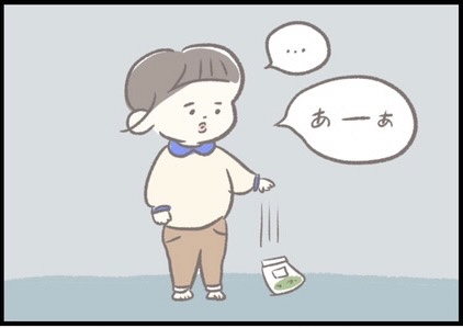 おやつが大好きなねむちゃん(1歳半)ですが、カボチャの種は食べられないと判断したようです。キラキラと目を輝かせていたねむちゃんのテンションが急降下する様子に思わず笑ってしまいました(笑)。「あーあ」と袋を手放す様子からもガッカリした気持ちが伝わってきますね。