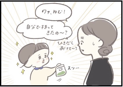 中身がお目当てのものではなかったのは残念ですが、おやつが食べたくて自分でひきだしの中を探し、みつけた袋をママに食べて良いか確認するなど、行動の一つひとつに成長を感じます。このあと、ねむちゃんは無事に別のおやつを手に入れたそうですよ。