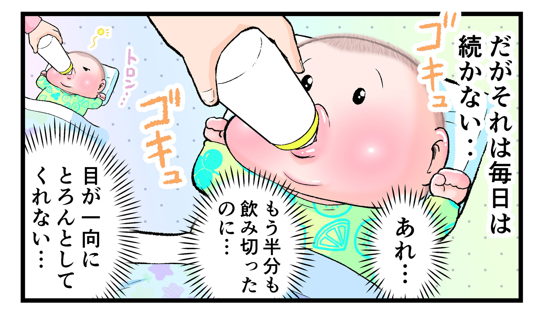 ミルクを飲みながら寝てくれる素振りを見せない長男・ぷにおくん(当時2ヶ月)に対する、にくきゅうぷにおさんの「寝てくれぇぇぇ」という心の叫びに共感するママは多いでしょう。赤ちゃんのキラキラ輝いた瞳に胸キュンするだけではなく、恐怖を感じることがあるのは事実ですね(笑)。