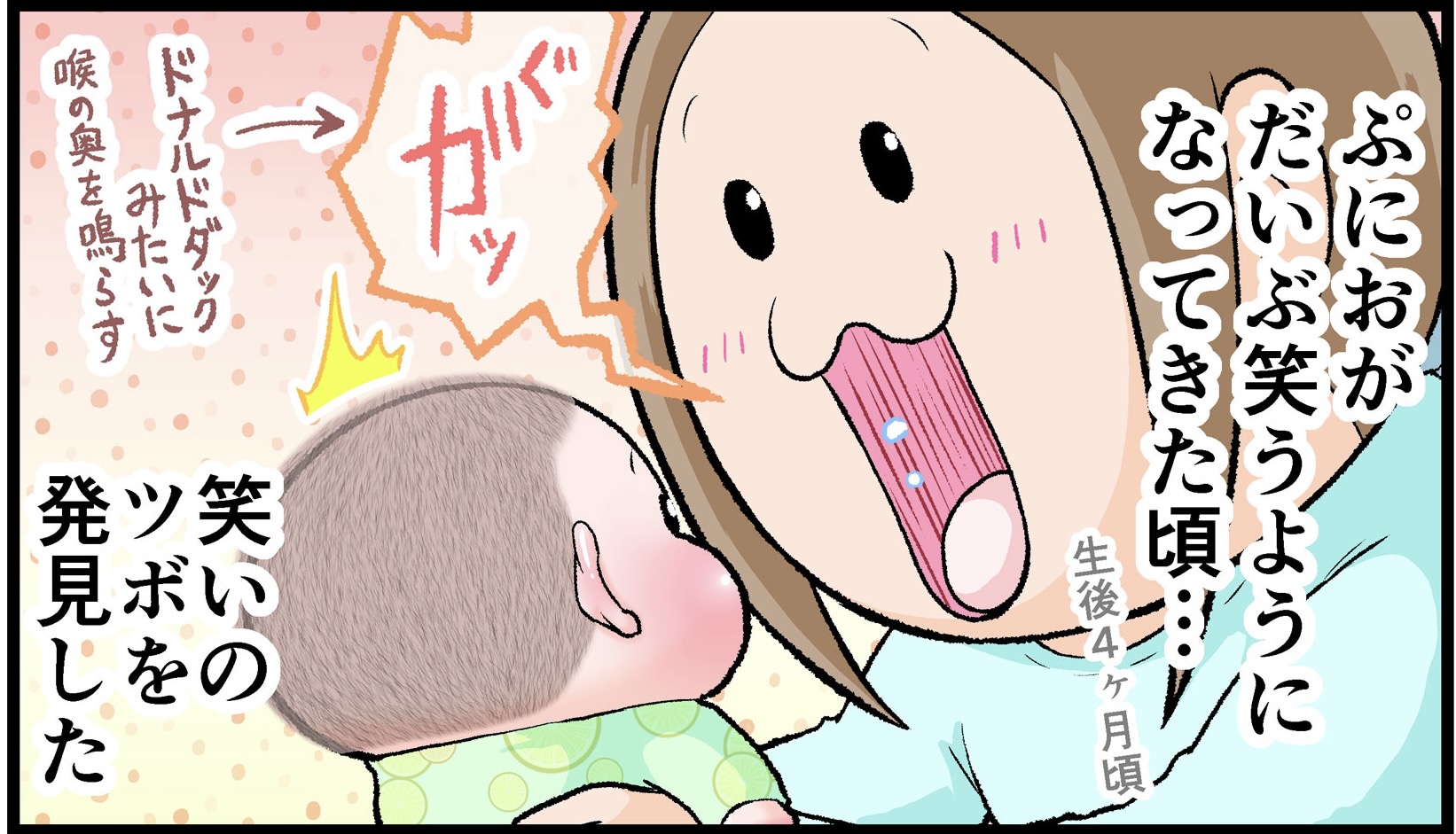 大人気にくきゅうぷにおさん(@nikukyupunio)の漫画をご紹介します。赤ちゃんの笑顔には周囲を幸せな気持ちにしてくれるパワーがありますよね。かわいらしい笑顔がみたくて奮闘するママやパパも多いのではないでしょうか。にくきゅうぷにおさんは長男・ぷにおくん(当時4ヶ月)の笑いのツボを発見し、ハリキリすぎた結果…。