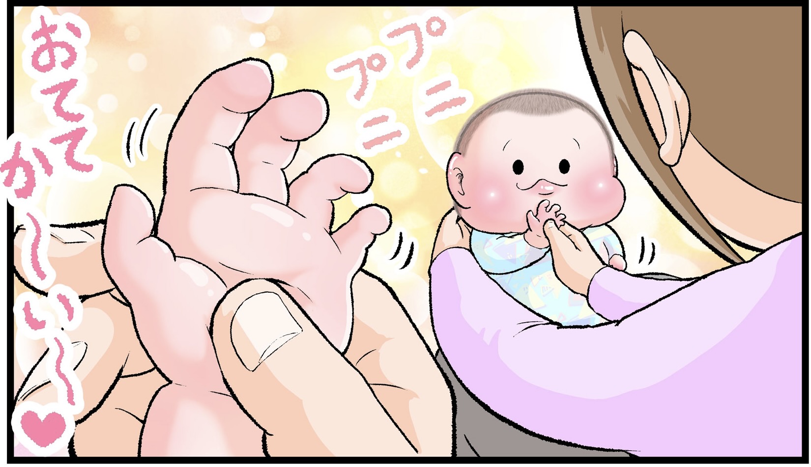 大人気にくきゅうぷにおさん(@nikukyupunio)の漫画をご紹介します。赤ちゃんとの戯れは、ママにとって至福の時間ですよね。赤ちゃんのかわいさに育児の疲れもやわらぐでしょう。さて、ぷにおくん(当時3ヶ月)と楽しくスキンシップをして癒やされていたにくきゅうぷにおさん。突然、ママをおそった想定外の悲劇とは…?