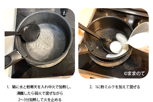 1.鍋に水と粉寒天を入れ中火で加熱し、沸騰したら弱火で混ぜながら2~3分加熱して火を止める