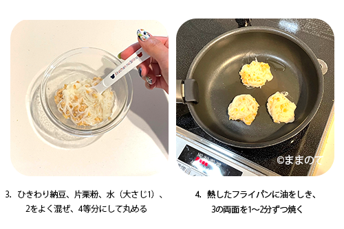 3.ひきわり納豆、片栗粉、水(大さじ1)、2をよく混ぜ、4等分にして丸める