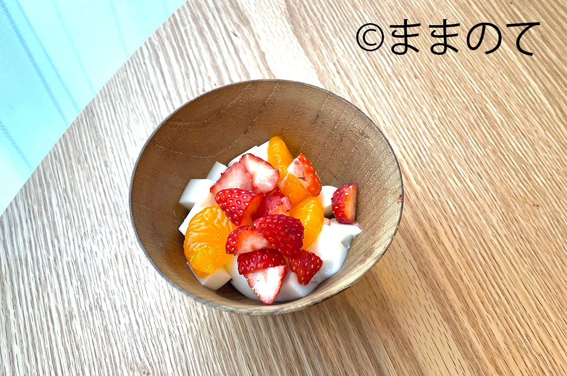 ゼリーは粉ミルクを使って作ることで、赤ちゃんにとってちょうど良い甘さになります。ゼリーと一緒に盛り付けるフルーツは、バナナやりんごなど、赤ちゃんが好きなものに変えてみても良いですね。