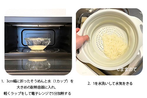1.3cm幅に折ったそうめんと水(1カップ)を大きめの耐熱容器に入れ、軽くラップをして電子レンジで5分加熱する