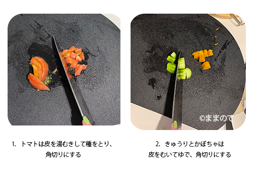 1.トマトは皮を湯むきして種をとり、角切りにする
