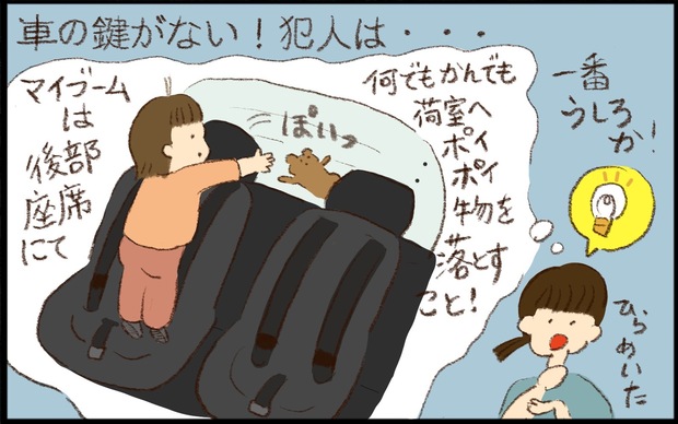 「車に乗る時に落としたかも?」と焦るパパ。夫婦で用事があり急いでいただけに、鍵がないことに焦り車内を探し回りましたが見つかりません。それでも車は走っているのでどこか近くにあるはずですが、気が動転しているパパが「最近流行っている車盗難手口のリレーアタックで、鍵がなくても電波をキャッチしてこの車は走ってるのでは」とよくわからないことを言い出しました。