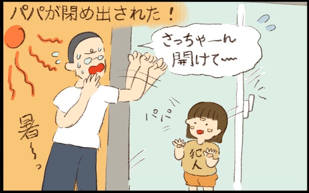 最終的にさっちゃんが気付いて玄関を開けてくれたとのことですが、夏の暑いなか外に閉め出されてパパはヘトヘト。しーちゃんのいたずらには困ったものです。