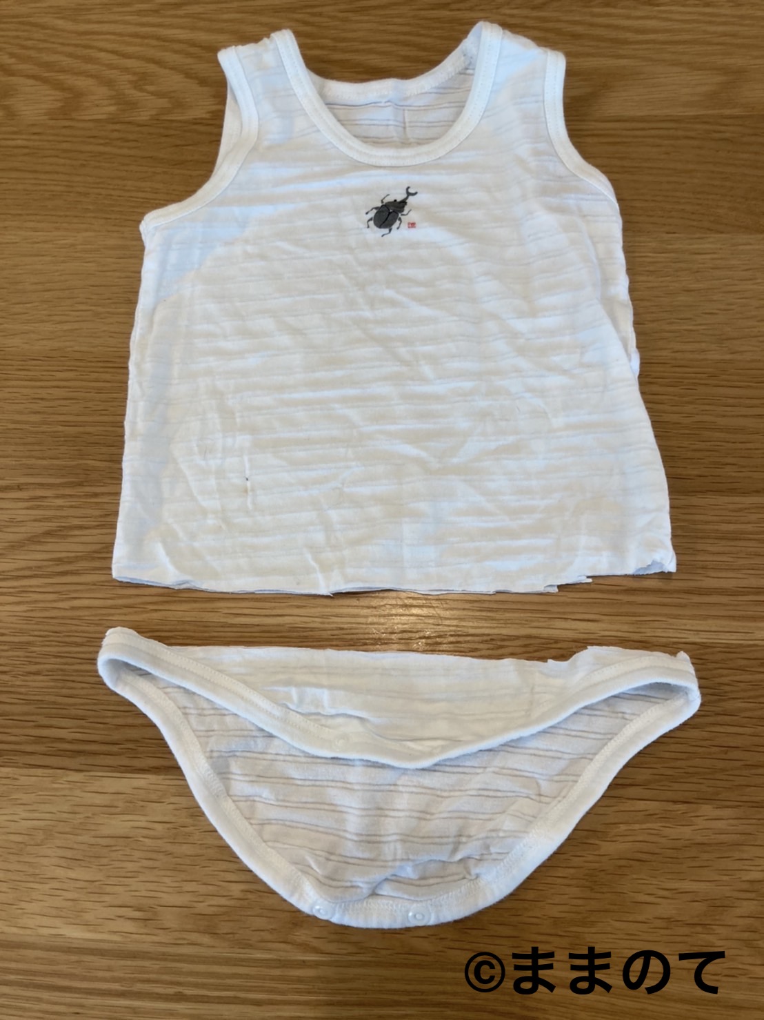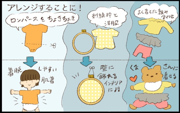 ロンパースを切ってリメイクした肌着。下の部分を切るだけで完成するので、手軽で真似しやすいアレンジですね。