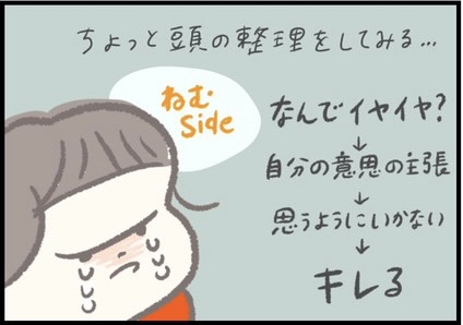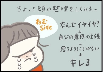 ねむちゃん(1歳11ヶ月)がイヤイヤ期に本格的に突入し、イライラしてしまうことが増えたつぶみさん。頭のなかを整理することで冷静さを取り戻そうと葛藤していると、子どもがイヤイヤ期なのに対して自分はイライラ期だということに気がついたようです。