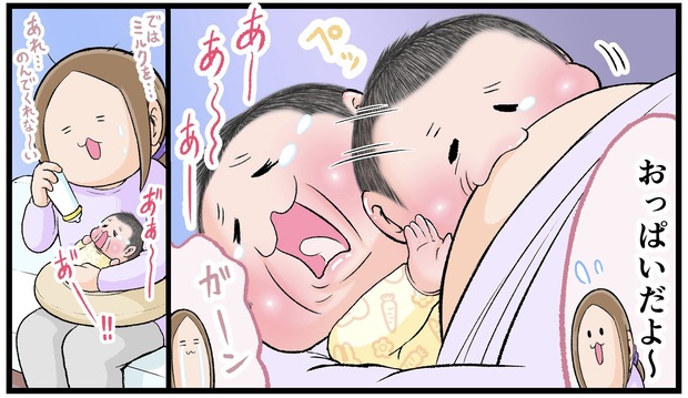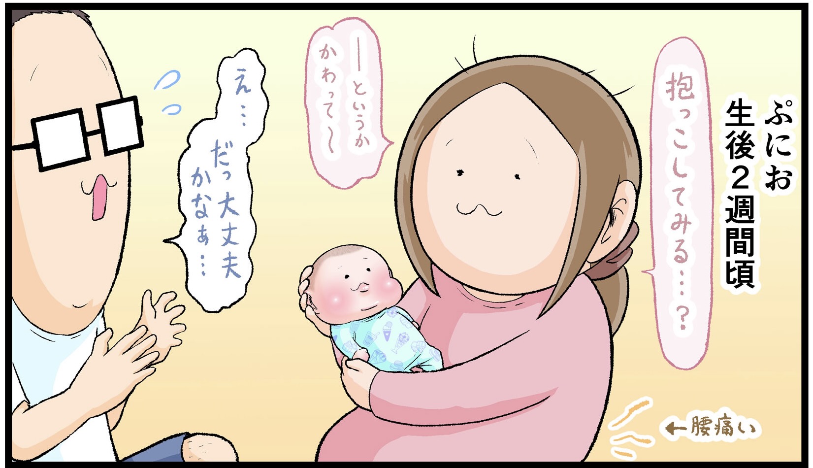 長男・ぷにおくん(当時2週間)は、ママの抱っこがお気に入りでパパの手に渡った瞬間、生後2週間ながら表情で気持ちを伝えていますね(笑)。ところが次男・ぷにすけくん(当時2週間)のときは、完全にパパ派!パパの素晴らしいアシストに感謝しながらも、少し切ない気持ちになるにくきゅうぷにおさんでした。