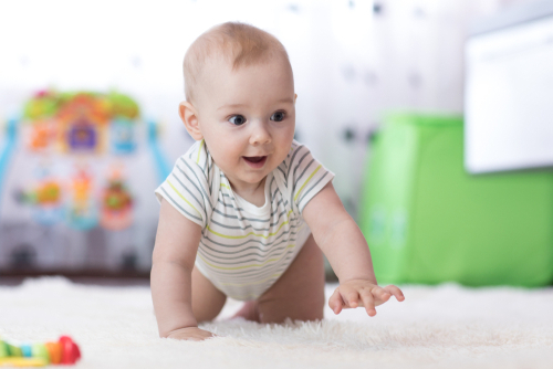 ママやパパはアイテムを挟んで赤ちゃんの向かいにいるようにして、赤ちゃんに声がけしながら近くに誘導します。赤ちゃんがアイテムを選ぶときは静かに見守るようにしましょう。