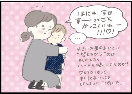 特別な日に、いつもと違う格好をして嬉しそうなほにゅくん(4歳)でしたが、お友達からの声かけに固まってしまったようです。泣いたり怒ったりするわけでもなく、4歳の男の子の頭の中ではどんな感情が渦巻いていたのでしょうか。