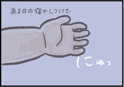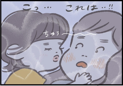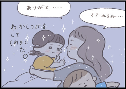 「私だって誰かに寝かしつけてほしい!」と思うつぶみさんにふと差し伸べられた小さな手の正体は、1歳8ヶ月頃のねむちゃんでした。まるでつぶみさんの心の声が聞こえたかのように、トントン&ちゅ〜とママを寝かしつけてくれたそうですよ。癒やされ感たっぷりの中、つぶみさんの心がふっと落ち着いていくような変化も見られますね。
