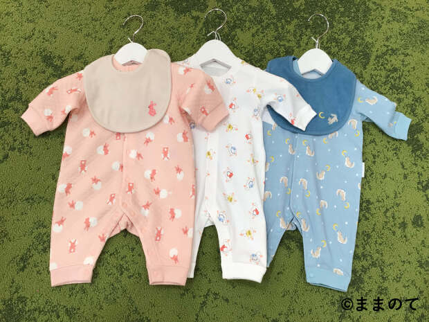 絵本の世界観がそのまま描かれてギフトとしても喜ばれそうです。寝かせたままお着替えできる前開きタイプと襟ぐりが大きく開くかぶりタイプがありますよ。