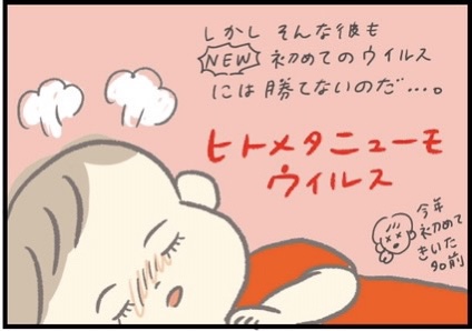 1歳のときは体調不良で保育園を休みがちだったものの、成長するにつれてほとんど病気をしなくなったほにゅくん(4歳)。いろいろなウイルスの耐性がついて強くなったと感心していたところに、初めての「ヒトメタニューモウイルス」が登場!家族内で感染しないように力を合わせて戦う、つぶみさんとほにゅくんでした。
