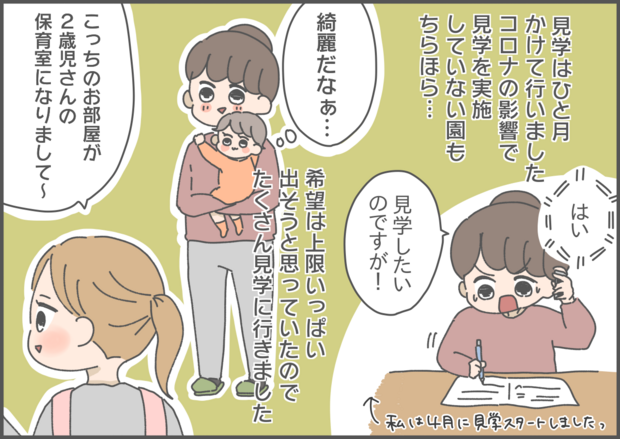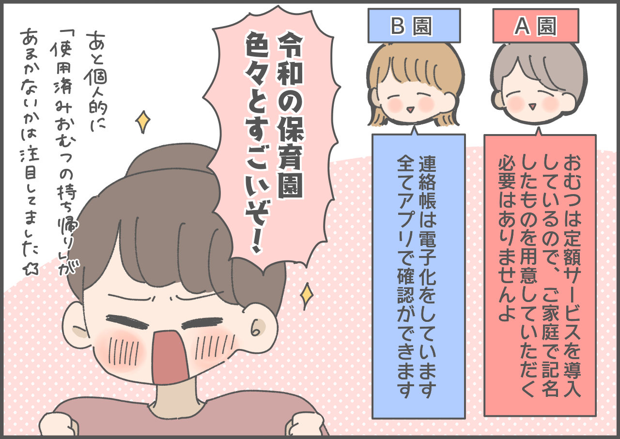 まずは保育園の見学からスタートした保活。実際に園を見てみることで、さまざまな違いを知ることができたようですね。園によりオムツ定額サービスがあったり、連絡帳は電子化されていたり、以前より更に進化をしている保育園。