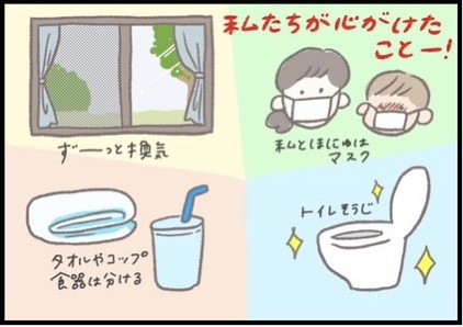 ヒトメタニューモウイルスにかかってしまったほにゅくん(4歳)。家庭内での感染を防ぐために換気をしたりタオルや食器を分けたりして対策をおこなったそうですよ。妹のねむちゃん(2歳)がコップを間違えてしまうハプニングに「絶対うつった!」と絶望したつぶみさんですが、なぜかねむちゃんは発症せず、無事に家庭内感染を回避することに成功したのでした。